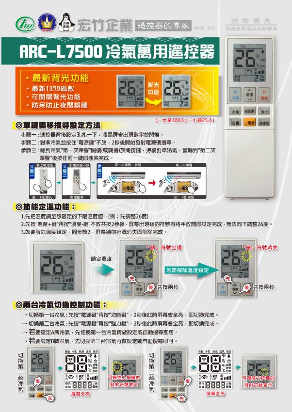 【企鵝寶寶】ARC-L7500(附背光功能)萬用型變頻/分離式/窗型冷暖氣機遙控器